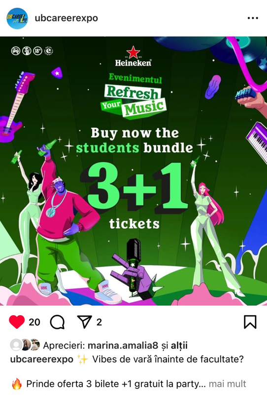 Colaborarea cu Heineken este un exemplu de integrare firească între online și offline, între experiență și comunicare. Împreună am construit campanii care au ajuns în campusuri, la evenimente, în feed-uri și în conversațiile tinerilor.
