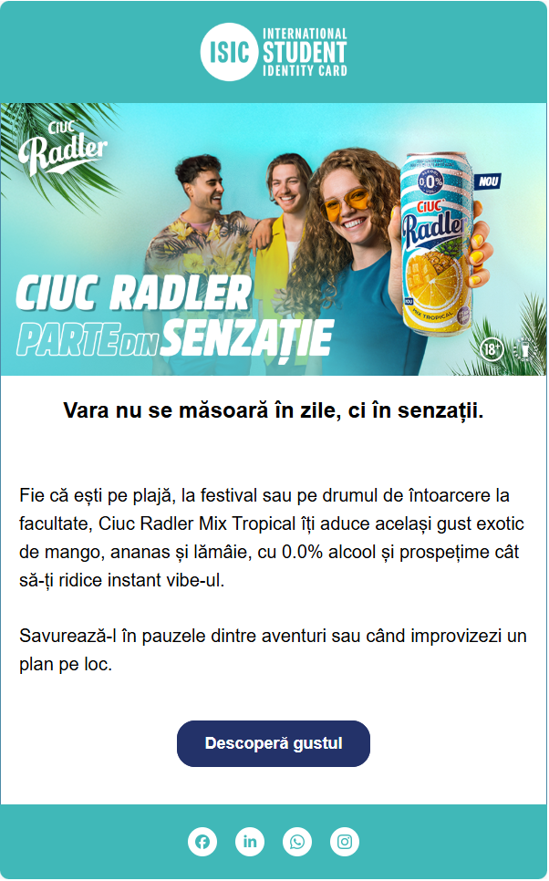 Un exemplu relevant este lansarea Ciuc Radler Mix Tropical, pentru care am implementat atât campanii online de amploare, cât și acțiuni de sampling la nivel național, astfel încât produsul să fie descoperit direct de publicul tânăr.